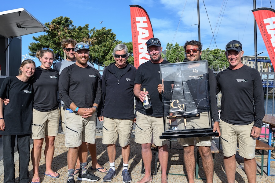 TnT (Tina Plattner and Tony Norris) kindly sponsored the event. They organised for the fleet to be moored in the V&A Marina. Tracey Whitehead ran the shore side of the event and did a great job in setting up the race village. The village included a coffee truck and a food truck serving breakfasts and a complimentary post-racing meal for all sailors. Ample seating was provided so sailors could chat about the day’s events with good tunes in the background. Daily after-race drinks were sponsored by North Sails, Ullman and Harken. Local South African teams turned on true Cape hospitality for the foreign teams.