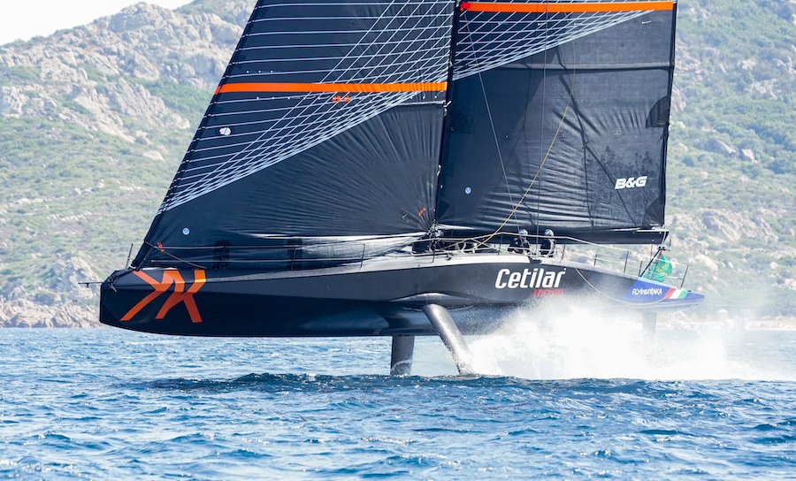 Day 4 was laid on for the benefit of the two canting keel boats with long reaches in 20 knot winds. We used our always-impressive cuben-fibre FRO on the 5 mile run from Monaci to Mortorietto. We enjoyed fantastic sailing with boat speeds reaching 26 knots; HF is easy to helm in these conditions with twin rudders. A real joy. But not fast enough to beat the canting keels so we got a third on that day. Fortunately My Song and Rambler were low scorers on other days so we were now 7 points ahead.